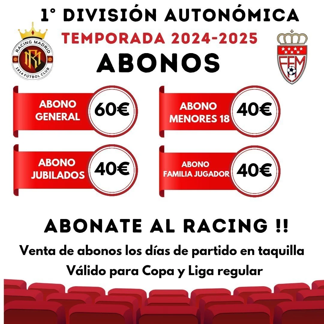 Ser abonado de Racing Madrid FC no es solo poder ver los partidos de fútbol. Es formar parte de la nueva historia que estamos creando, vivir la emoción del fútbol en y compartir momentos únicos con otros de aficionados. Cada partido es una nueva oportunidad para gritar goles, celebrar las victorias y apoyar al equipo en cada jugada.